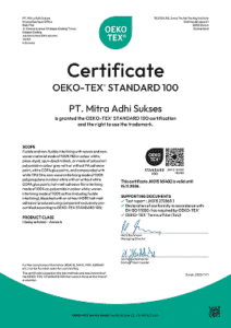 PT. Mitra Adhi Sukses is granted the OEKO-TEX® Standard 100 certification and the right to use the trademark.